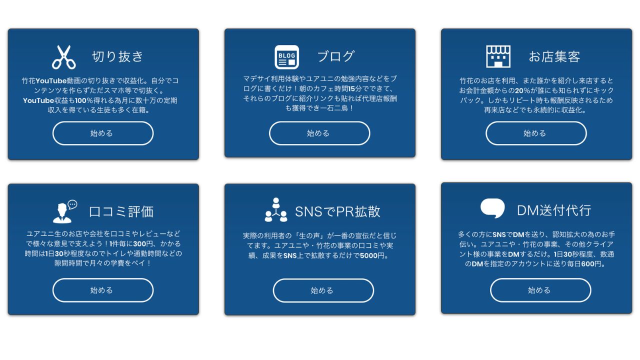 ユアユニで学んだことをブログに書けば1記事2,000~4,000円、動画編集講義を活かして竹花さんの動画切り抜きを投稿すれば1本800円など、「学校が生徒にお金を支払う」というユニークな仕組みが特徴です。